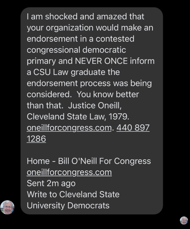“Bill, your approach gives me pause. It is unbecoming of a candidate to engage with fellow Democrats and possible constituents this way (since many CSU students commute from Lake and Geauga counties).