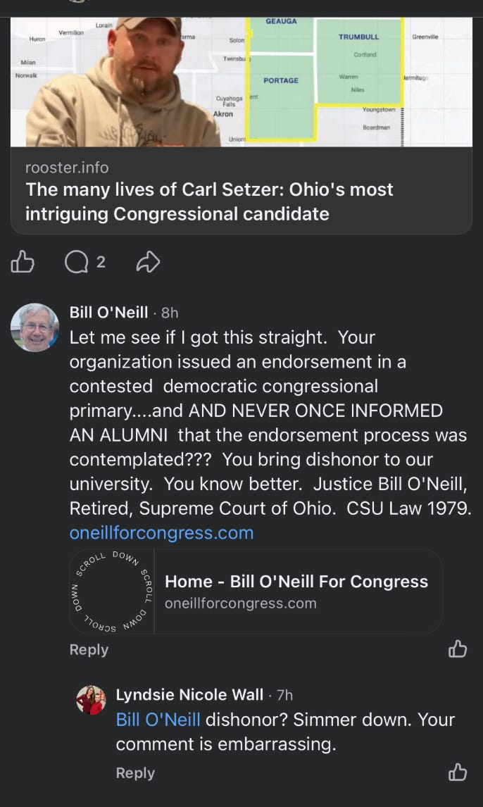Bill O’Neill has an impressive resume. No one is disputing that. That resume does not entitle him to the endorsement of a student organization he never engaged with. Signing a Facebook comment as “Justice Bill O’Neill, Retired, Supreme Court of Ohio” isn’t a credential in this context. It could be viewed as a threat dressed up as a signature.