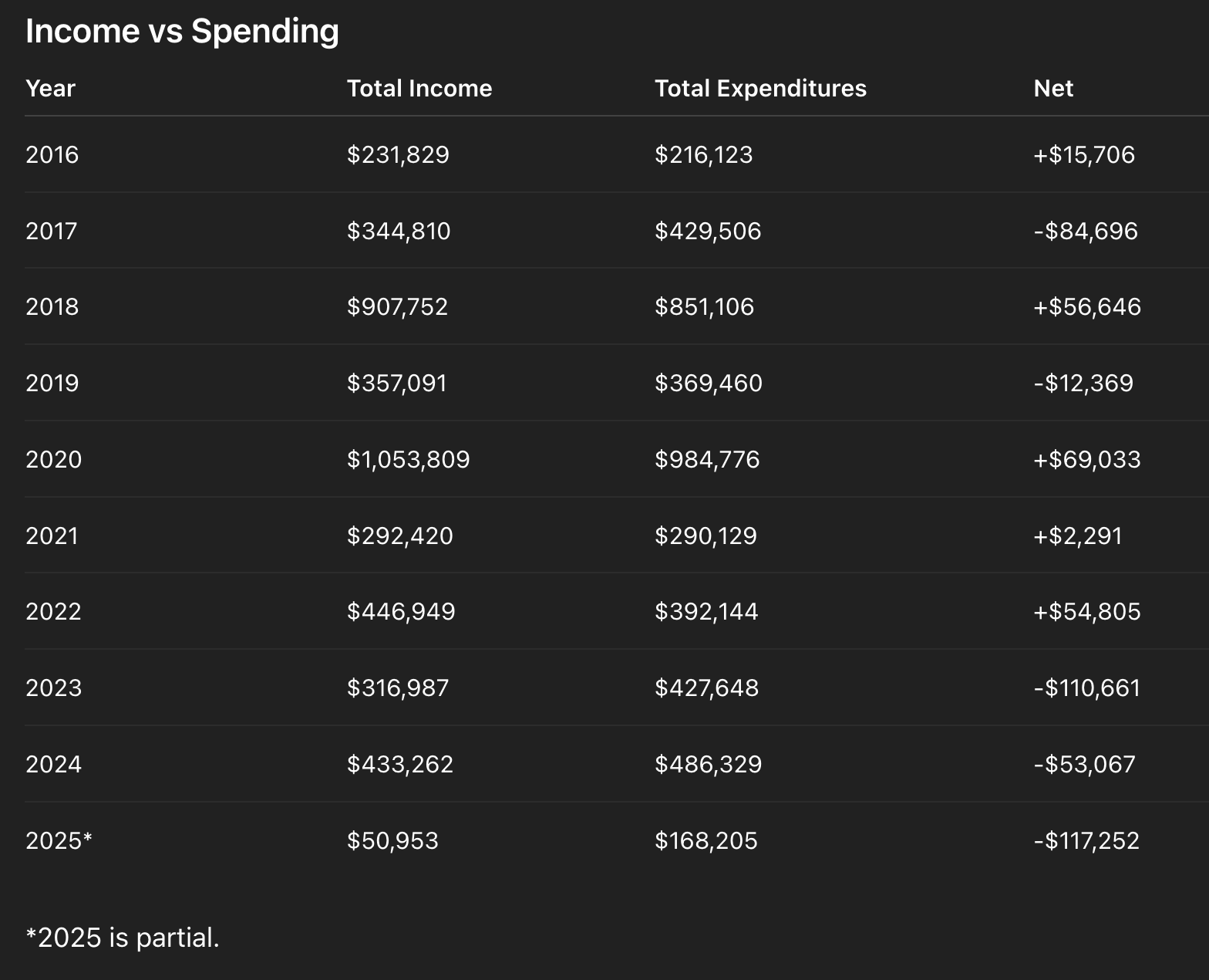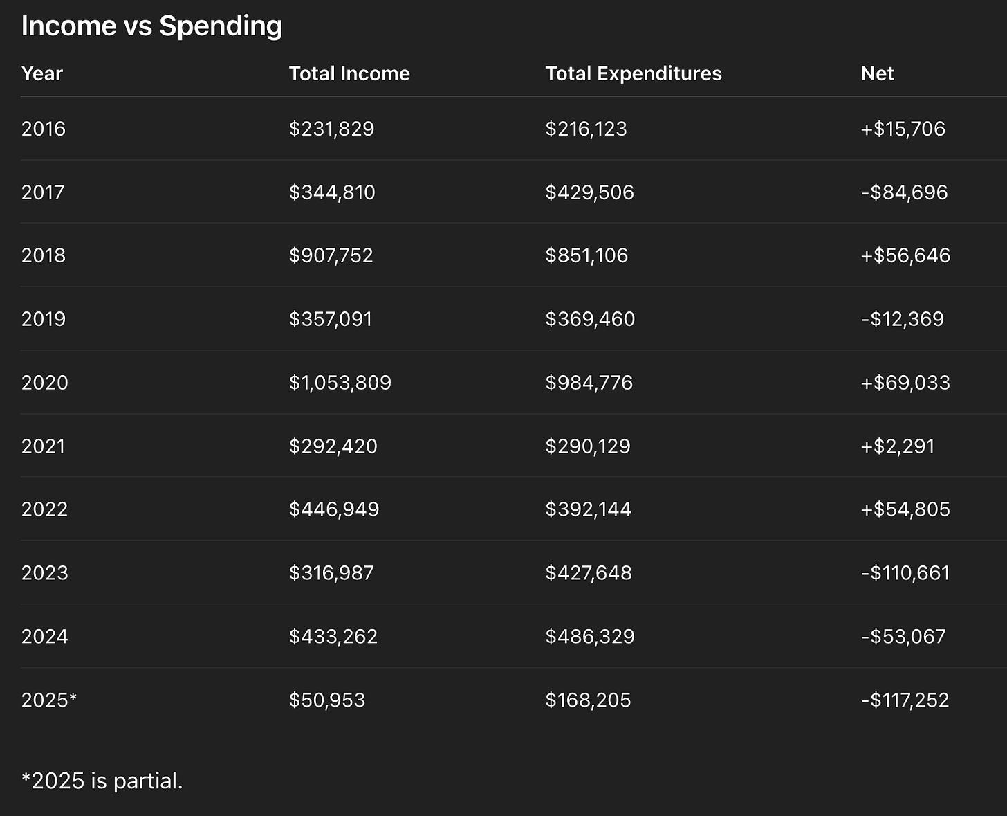 Baseline income before 2023 (excluding peak election spikes) sits around the mid-$300K range. After adding ~$140K in new costs, income increases by roughly ~$40K.