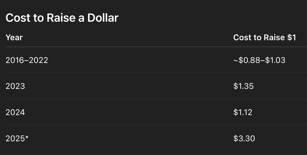 After 2023, it is consistently spending more than it raises to generate each dollar.
